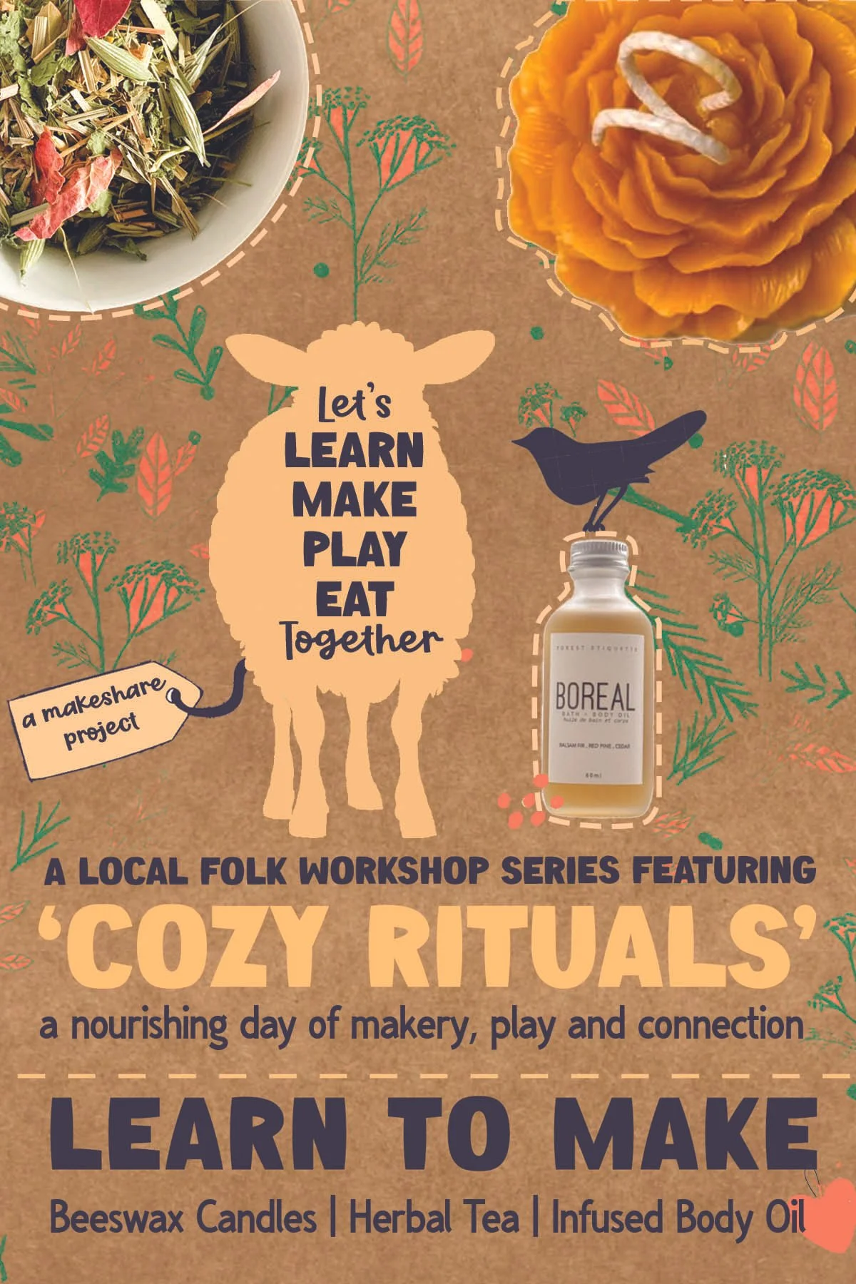 3 beautiful handmade ‘Cozy Rituals’ products. Take comfort with other good local folk and enjoy provided Drinks & Midday Forest Walk & Communal Lunch from Sea Cider.